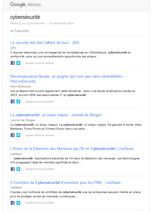 1. Google Alerts : Avec Google Alerts, des alertes sont configurées pour des mots-clés tels que protection des données personnelles, cybersécurité. Ces alertes envoient des emails chaque fois que des nouvelles sur ces sujets sont publiées.